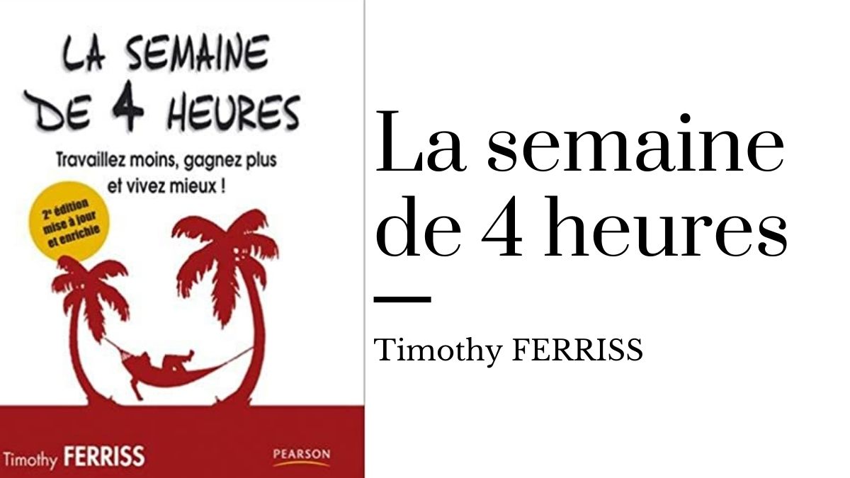 Résumé du livre La semaine de 4 heures : La majorité des personnes restent employées toute leur vie, et travaillent de 9H à 17H pendant 40 ans pour prendre leur retraite à 60 ans (ou plus) ; par le biais du livre La semaine de 4 heures, Tim Ferriss nous explique comment briser ce schéma, en réduisant significativement notre temps de travail, en nous libérant de la contrainte géographique – nous permettant ainsi de vivre partout dans le monde – et en automatisant nos reAvenus, pour nous permettre de faire des mini-retraites quand cela nous chante et de vivre nos rêves.